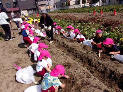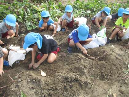 全園児で芋掘りに行きました。しゃもじ片手に掘り進めますが、晴天続きで硬い土に加えて土の奥深いところにあり、なかなか出てきません。子どもたちは無我夢中で掘り進め、立派な芋が出てきた時には満面の笑顔。3歳児からは掘り出すと「おめでとう」と芋の誕生を祝う声が聞かれました。4.5歳児は途中土から出てくる虫に悪戦苦闘しながらも黙々と掘り進め、中でも5歳児は芋の大きさや数にも興味をもち、困っている友達を助ける姿もありました。