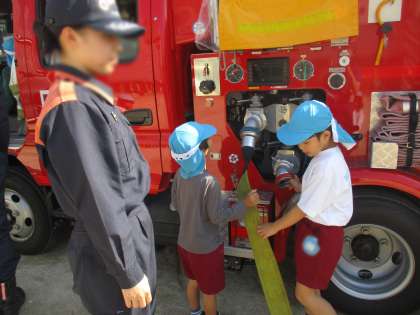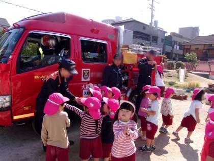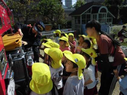毎月様々な想定の避難訓練を実施しています。今回は火災想定で計画し、消防署の方をお招きして、ご指導していただきました。最後には消防車の見学もさせていただき、子どもたちは興味津々で質問していました。こうして憧れの職業にも親しみをもち、子どもたちの中に積み重なって『夢』につながるのでしょう。