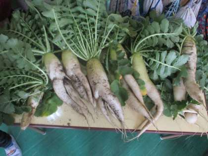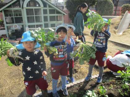 種から大根を栽培してきた5歳児うみ組。一足先に持ち帰ったミニ大根はすりおろしたり、味噌汁に入れたりして食べたようです。甘くてカブのようなホクホク感もあったと聞きました。自分たちの手で育てて持ち帰った野菜なので、自慢気に家族みんなに「私の大根食べていいよ」と言っている姿も聞き、食べ物を大切にする気持ちが育っています。