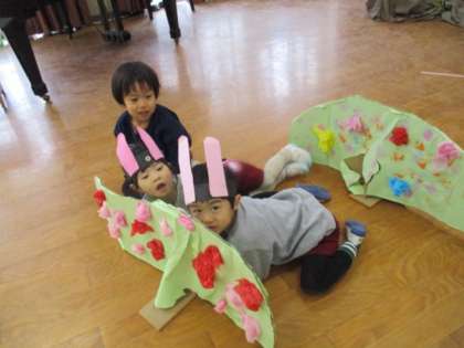 これまでにクラスで親しんできたケンパやかくれんぼ、だるまさんがころんだなど、動物たちが伸び伸び遊びます。