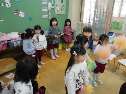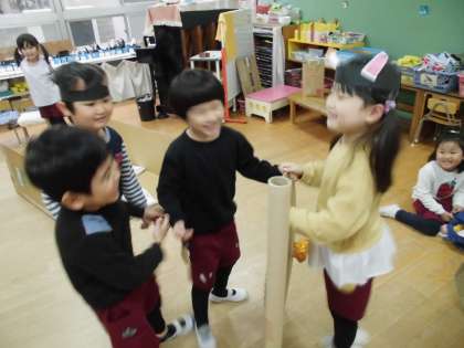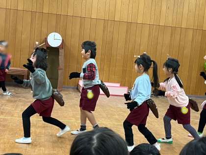 お家ごっこやステージごっこを楽しんできていたきく組。劇遊びでは『おおかみと7ひきのこやぎ』を共有の題材として、ドアを介して友達とのやりとりを楽しんできました。それぞれの役の気持ちやイメージをを伸び伸びと表現しています。相手への思いやりの気持ちを大切にしたいという子どもたちの思いから、結末はお話通りではありません。子どもたちと一緒に考えて進めてきた劇遊びをお楽しみください。