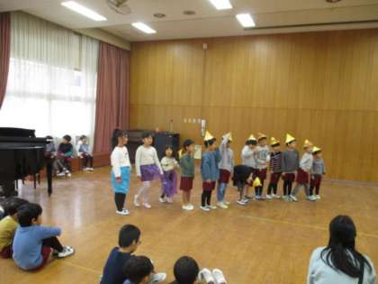 5歳児の子どもたちとは、表現遊びを楽しむ中で、それぞれの役の気持ちを考えました。また、必要な物や劇遊びの進め方を話し合い、自分たちでつくってきました。幼稚園生活最後の発表会として、友達と力を合わせて進めることにも気付き始め、助け合いも見られます。登場人物だけではなく、サイドの子どもたちや暗闇での姿にも注目してほしいです。