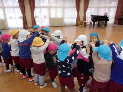 今年度日常的に異年齢の関わりをもてるように保育を進めてきました。登園時の手伝いに始まり、園外保育や園行事をきっかけにしながらも保育室を行き来したり、園庭で一緒に遊んだりしてきたことで、今ではクラスを越えて大好きなお兄さんお姉さん、年下の友達も見つけ、自然と一緒に遊ぶ姿もあります。生活発表会では、生活の一部として異年齢で遊ぶ様子も見ていただけるように計画しています。