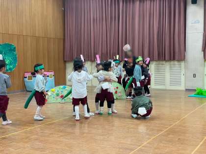 初めての生活発表会。お家の人がたくさんいる普段と異なる空間の中、大好きな先生と一緒に楽しく遊んでいるところを見てもらいました。幼稚園で先生や友達と楽しく過ごしてきたことが伝わったのではないでしょうか。