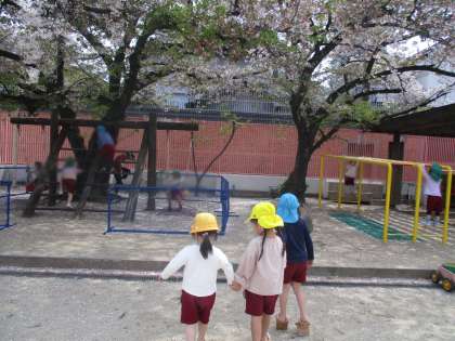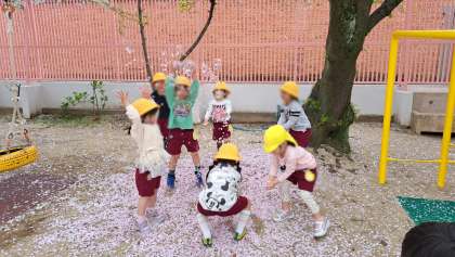 五条幼稚園には大きな桜の木があります。満開の木に風が吹くと桜吹雪のように舞ってきます。するとあっという間に地面はピンク色に!子どもたちはその様子に心をはずませ「桜の雪みたい」「ピンク色の地面になった」と自分なりの感性で春の季節を感じています。