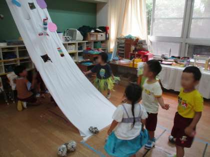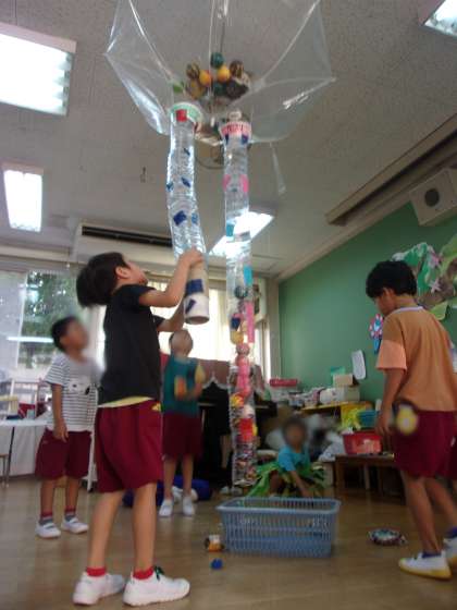 4歳児は、新聞紙遊びをしてから新聞紙ボールをつくってボール投げをして遊んでいました。もっと楽しく、何回もやりたくなるような…と考え、傘を使ったり、部屋の天井から床まで投げられる的をつくったりして遊びました。すると次第に入ったボールを転がそうと遊びが発展し、転がすためにも繰り返し投げる姿がありました。