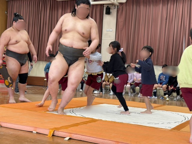 伊勢ヶ濱部屋の力士さんが2人幼稚園に来てくださり、稽古を見せてくださったり、子どもたちと相撲を取ったりして遊びました。