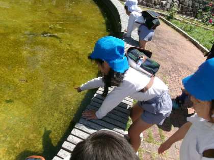 バラ園のお池には、オタマジャクシが泳いでいました。「カエルのあかちゃんやで」「かわいい!」と、じっくり観察して楽しんでいました。