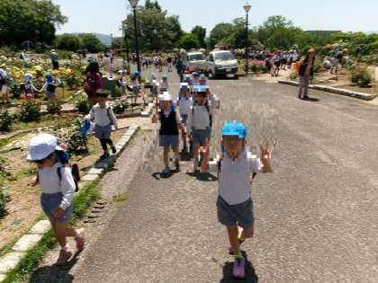 保護者の皆様は、大芝生で和やかに楽しく学級懇談会をしてくださっていました。皆さん笑顔でとても楽しそうでした!その間、5歳児は、風車の丘〜バラ園まで探検に出かけました。