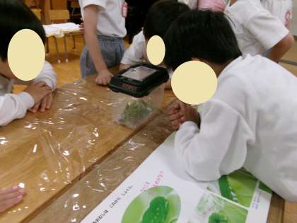 今朝の登園時に部屋の真ん中にアオムシを置いておくと、「可愛い」「いっぱいうんちしてる!」「葉っぱを食べてる時、後ろの足で葉っぱをつかんでるよ!」「おもちゃで遊ぶかなぁ?」と子どもたちなりに発見したことや思ったことを伝え合う姿がありました。