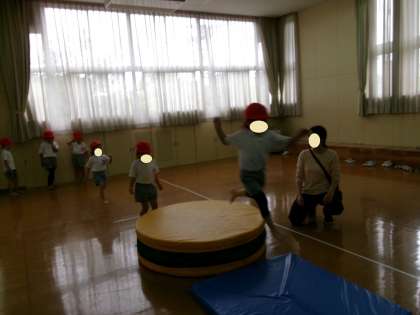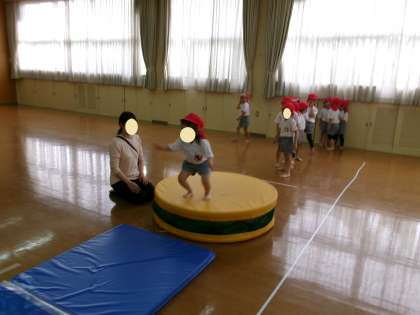 大きなトランポリンを使って、元気よくジャンプ!!!最初は両足跳びが難しく苦戦する姿がありましたが、何度もしていくうちにだんだんと跳ぶことも、着地も上手になっていきました。元気なバッタになりきって跳びはねていましたよ。