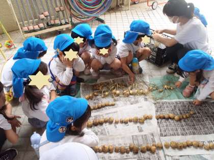 写真2枚目 並べて数えると、みんなの分があることが分かりました。「持って帰りたい!」「これがいい!」みんなが一番大きいのをねらっています。