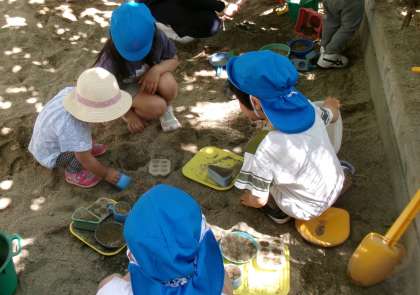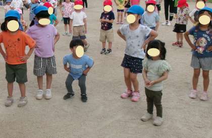 フープや砂場、サーキットで遊んだり、体操をしたりと園庭で小さなお友達と一緒に遊びました。5歳児の子どもたちは、小さいお友達が遊べるようにと考えながらサーキットを並べて準備してくれました。そして「一緒に遊ぼう!」と誘ったり、「これはこうして使うんだよ!」と教えてあげたり、優しい気持ちで関わっていました。