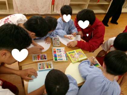 はな組は、みんなの部屋でなかよし遊びをしてから傘の製作をしました。高校生のお兄さんお姉さんにもお手伝いしてもらい、お部屋の中は子どもたちと高校生の笑い声や話し声でとても賑やかでした。
