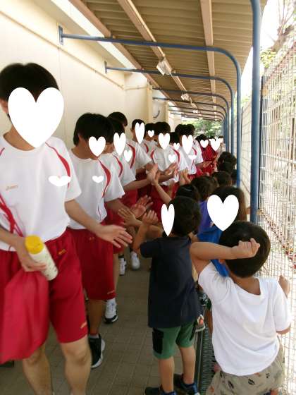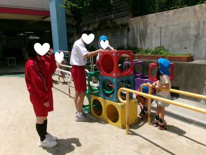 はな組もそら組も高校生への親しみの気持ちをもって、思う存分関わる楽しさ味わっていました。とても楽しかったようで、お見送りの時になかなか離れられず、お互いの「またねー!」「バイバーイ!」の掛け合いの声が鳴りやまないほどでした。