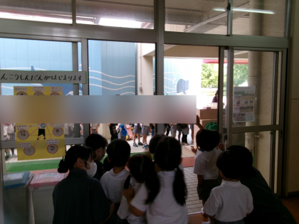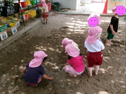 今日は、4・5歳児が園外保育でした。朝、出発するはなぐみ・そらぐみのお友達に「いってらっしゃーい!」と声をかけて見送った後は、園庭で水遊びをしました。ももぐみだけで砂場を存分に使って水を触ったり、ホースからシャワーの水を出して足にかけたり、泥をつくったりして遊びました。水を勢いよく砂に流し込むと、泡ができたことに驚き「アワアワになってる!すごい、見て見て!」と友達を呼んで遊ぶ姿もありました。遊んだ後も、「シャワーが楽しかった!」「アワアワ、すごかったなあ」と思い出して“また遊びたい”という気持ちが膨らんでいる様子でした。
