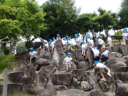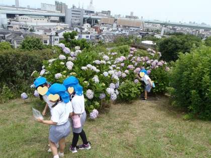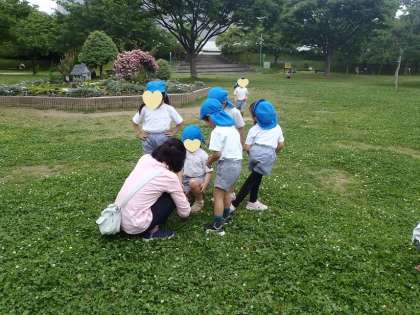 公園では、『だいだいだいぼうけん』の歌を口ずさみながら、丘の上まで探検にでかけました。岩登りにチャレンジしたり、植え込みのトンネルをぬけるとアジサイのお花が咲いていたり、バッタをつかまえたり…ワクワクドキドキの探検でした。