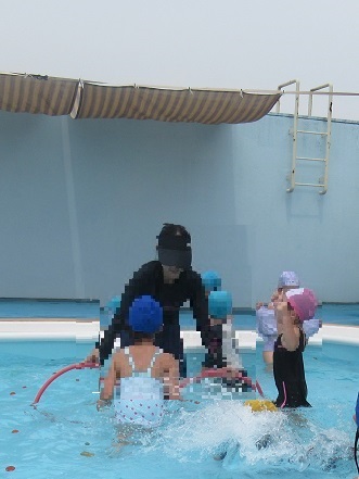 音楽に合わせて保育室で楽しんでいる体操をしたり、魚の遊具を浮かべてすくって遊んだり、5歳児はプールを海に見立てて「深いところまでいってみよう」とトンネルくぐりに挑戦したりして遊びました。