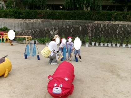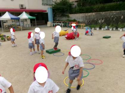 園庭で準備をする時に、教師が「小さい子はどんな遊びが楽しいかな?」と子どもたちに問うと、「このトンネルはここにしよう!」、「ジャンプする台はこことあそこに置いてみる?」、「フープを道にしてみよ!」と、自分たちで考えながら進んでサーキット遊びの準備をしていました。遊びに来た小さなお友達に三輪車の乗り方を教えてあげたり、フープの電車に誘ってみたり、思いやりの気持ちをもって関わる姿が見られました。