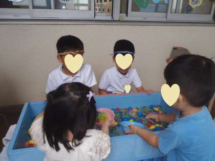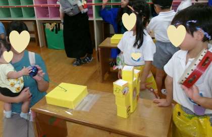 夏まつりを楽しんだ翌日、5歳児はお店屋さんになって、地域の未就園の子どもたちを夏まつりにお招きしました。