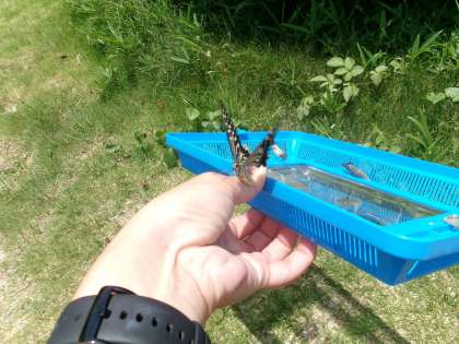 飼育ケースの中は狭くてチョウの羽を傷つけてしまうので、担任が責任をもって園庭に放しました。