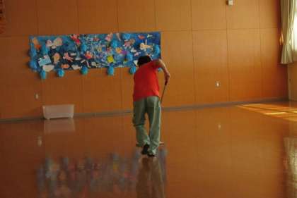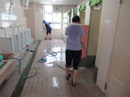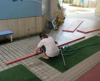 また、園舎で日ごろなかなかきれいにできないところ、例えば、トイレのすのこの下や隅々、倉庫や教材室などを掃除したり、整理したりしています。事業担当主事さんは、全部の部屋や廊下にワックスをかけて、ピカピカにしてくれました。そして、園庭の草がどんどん伸びるので、毎日涼しい午前中に少しずつ、汗だくになりながら草抜きなどもしています。