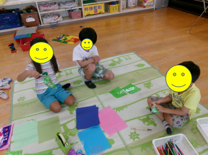 暑いのでなかなか外では遊べませんが、保育室ではブロックや折り紙、ぬり絵など友達と一緒に楽しんでいます。