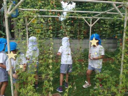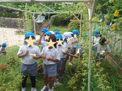 地域のなにわの伝統野菜です。名前の由来を園長先生から教えていただき、興味をもって聞いていました。「いい匂いする」「メロンみたいなにおいじゃない?」と、友達と順番に手に取り合っていました。