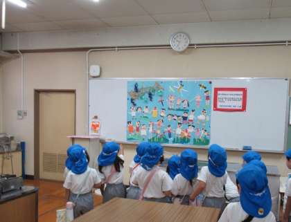 教室では中学生の作品や絵を見せていただきました。真田山幼稚園をはじめ、地域の幼稚園と小学校の作品も展示してくださっていました。