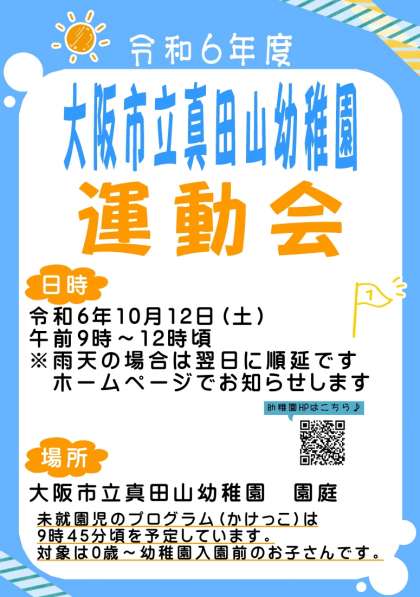 令和6年度 運動会について 公開日 2024/10/02 更新日 2024/10/02 幼稚園日記 10月12日(土)〈雨天延期は13日)は真田山幼稚園運動会です。 地域の未就園の方のプログラム(かけっこ)もあります。 予約は不要です。ぜひお越しください♪ いいね(0)