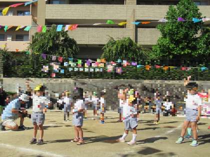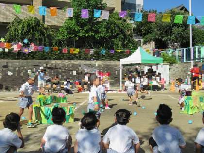 4歳児のリズムでは、虫が大好きな子どもたちが、トンボやチョウチョウ、バッタになりきって、虫の動きをとても可愛らしく表現してくれました。日頃から、園庭に出ては、虫探しをしたり、育てたりすることに熱心だった子どもたちの様子がこのリズム遊びを通して伝わってきましたよ!!