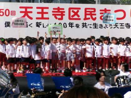 昨日は、だいしんスポーツガーデンGOJYOで天王寺区民まつりがありました。天王寺区市立幼稚園5園の5歳児が集まり、高津中学校の吹奏楽部の生徒さんの演奏で、『大阪市歌』と『さんぽ』を歌いました。『むしむしじゃんけん』もしました。たくさんの人の前で、少し緊張していましたが、笑顔で楽しんで歌うことができましたよ!