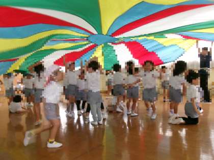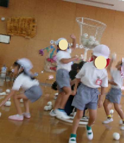 みんなで遊ぶコーナーでは、誕生児のお友達と保護者の方と一緒に力を合わせて、玉入れをしました!子どもたちも保護者の方も、相手チームに勝ちたいという気持ちが伝わってきて、よい勝負でした。また、そら組がバルーンを風船のように膨らませた中に、はな組・もも組が入り、大喜び!!バルーンの中でうれしそうに走る子どもたちが印象的でした!楽しい時間は、あっという間に終わりました。