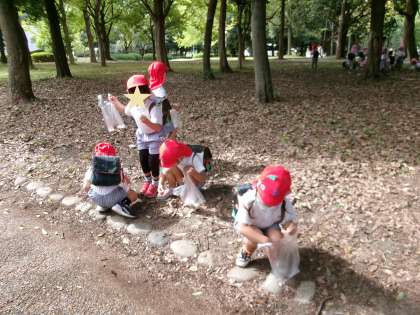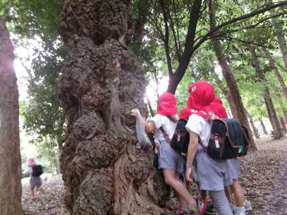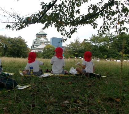 はな組は、もも組さんと一緒に天守閣近くの広場まで行きました。途中、どんぐり拾いをしたりや大きな木の幹に登ってみたりと自然散策を楽しみました。お弁当は、天守閣を真正面から見えるところで食べ、外で食べるおにぎりはとても美味しかったです!