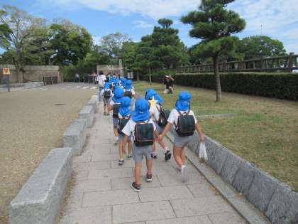 そら組は、はな組ともも組と分かれ、天守閣へ行く道の途中の階段で何段あるか数えたり、木々がたくさんある場所でどんぐり拾いをしました。その後、すぐに出発し、天守閣へと向かいました。
