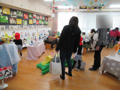 保護者の方に、楽しみながら一生懸命につくったり、かいたりした作品を見てもらいました。子どもたちは、たくさん褒めてもらい嬉しそうな表情をしていました。自信につながったことと思います。