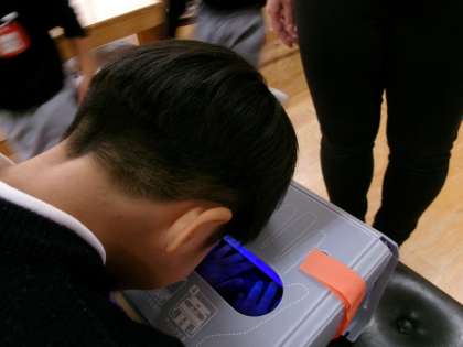 昨日4歳児に手洗い指導をしました。絵本『インフルエンザウイルスのフルくん』のお話をしました。かぜバイキンよりも強いフルくんは寒い季節になるとやってきて、人の鼻やのどに棲むのが大好きです!一度体の中に入ると、あっという間にどんどんバイキンを増やしていきます。どうしたらフルくんみたいなかぜバイキンを増やさずにすむのか子どもたちに聞いてみると、「手洗い」「うがい」と答えてくれました。冬になると感染症が流行しやすくなる一方で、手洗いをするのがおっくうになります。そこで『手洗いチェッカー』を使って、今の自分の手は、きれいなのかどうかを見てもらうことにしました。白く光っているところにバイキンがついています。恐る恐る手を見てみると、、、「うわぁー!!いっぱいバイキンついてる!!」とビックリする子どもたち。バイキンは目に見えないところにいて、いつもみんなを狙っていますよ!『あわあわてあらいのうた』で、洗い残しがないようにみんなで手洗いの確認をすることにしました。今日から、ていねいに手洗い・うがいをしてバイキンにさようならしましょうね!