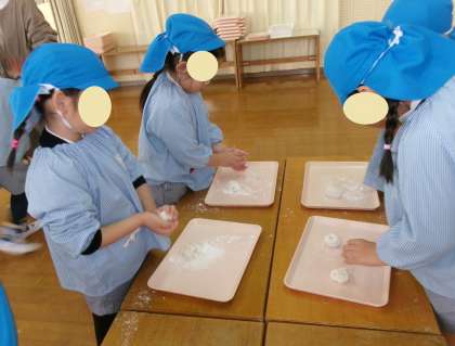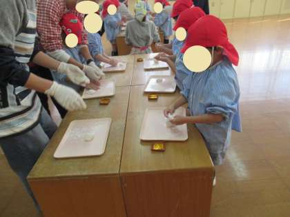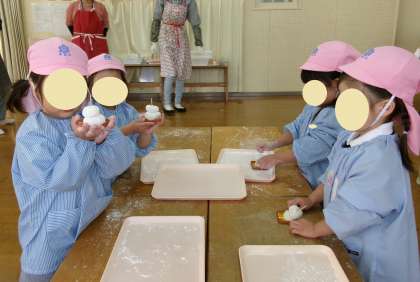 もちが出来上がりました!できたおもちを早速丸めて、鏡もちをつくりました。子どもたちは、出来立てのおもちを触ると、「あったかい!」「まるめれた!」と嬉しそうに教えてくれました。事前につくった三宝に丸めたおもちを乗せて、鏡餅づくりを楽しみました。