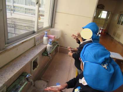 今日5歳児に手洗い指導をしました。絵本『インフルエンザウイルスのフルくん』のお話をしました。フルくんは、ニワトリのうんちが風に乗って人の体に入り込み、毎年変身を繰り返しながら、人の体で増えることができます。これからとても寒い日が続きます。冷たい水で手洗いをするのにも少し気合いがいります。そこで、4歳児でも行った『手洗いチェッカー』を使って、手のバイキンを見てみることにしました。「めちゃ光ってる!!バイキンや!」「わあーバイキンいっぱい!!」とビックリする子どもたち。早速『あわあわてあらいのうた』で、子どもたちだけで手洗いをしてもらいました。忘れている子も周りの友達に教えてもらいながらしました。実際に手洗い場で石鹸を使って手洗いをしてもらい、もう一度手洗いチェッカーで見てみることに・・・。すると、「手光ってない!」「バイキンない!よっしゃー!」と、とてもきれいに手洗いすることができました。3学期もかぜや感染症に気をつけて、みんなで手洗い・うがいで元気な毎日を過ごしていきましょうね!
