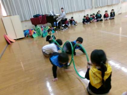 子どもたちが大好きなお話『ぎろろんやまの10ぴきのかえる』のお話で劇遊びをしています。