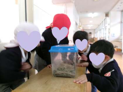 他にも、2学期に見つけた何かの幼虫を大きな飼育ケースにお引越ししている子や、ドンジャンケンをしている子、発表会での遊びの合間も、伸び伸びと好きな遊びを楽しんでいます。