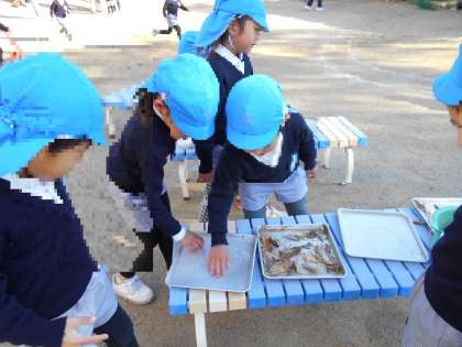 飛んできた葉っぱが一緒に固まっていたり、容器と同じ形の氷ができていたりするのを見て、子どもたちの関心が一気に高まりました。