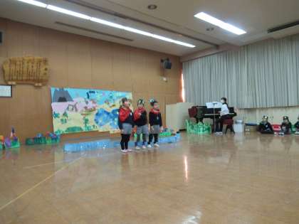 思い思いになりきって体を動かすところや一人ずつ話すところ、道具を動かして場面を変えるところや、友達と一緒に声を合わせるところ、歌うところや踊るところなど・・。