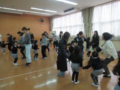 3月5日に、PTA決算総会の後、各クラスで子どもたちと保護者の方と一緒に遊びました。5歳児は、生活発表会で行った、『ぎろろんやまと10ぴきのかえる』の中からしゃっきりだけのダンスを子どもたちから教えてもらったり、スキップじゃんけんをしました。リズム室では、大人チームと子どもチームのドッジボール対決をしました。大人の手を抜かない真剣勝負に子どもたちも負けじと逃げては必死にボールを投げます!勝負の結果は、大人チームの勝ち!!子どもたちは、とても悔しい様子。。。しかしながらとても楽しい時間を過ごすことができました。