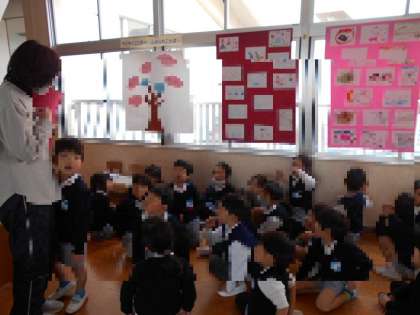 先生たちとの思い出や一緒にして楽しかったことを話し合うと、たくさんお話がでてきました。「おはようって毎朝言ってもらった」「こまを教えてくれたよ」「困ったとき助けてくれたよ」「すごいねって言ってもらった」などなど、心が温かくなる話が出てきました。その思い出を絵や字で表現して、今日はお手紙にして、先生たちに渡しにいきました。