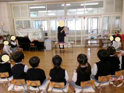 紙芝居『さんじょう!てあらいかめん』のお話から、手洗いをしない子どもの手には、目に見えないバイキンがたくさん付いていて、すぐに見つけることができるてあらいかめんが、バイキンがどこについているかを教えてくれます。早速子どもたちに、手を洗わない手のバイキンの数、水だけで洗った手のバイキンの数、石けんを使って洗った手のバイキンの数をそれぞれ伝えると、、、「いっぱいいてる!!」とビックリ!