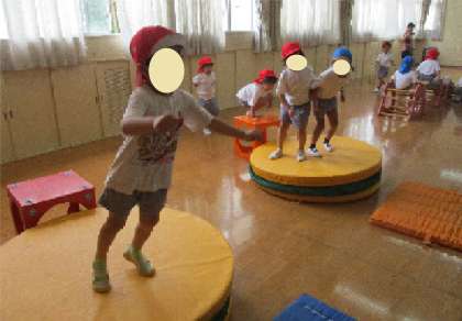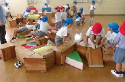 そこで、先生がリズム室に小さなすべり台を1つ出しておいたところ、5歳児の子どもたちが「公園をつくろう」と遊具を並べ始めました。すべり台や大きなトランポリン、鉄棒などがある、リズム室公園で体を思い切り動かしました。大型積み木を電車やお家に見立てて並べ、「電車に乗っていくの〜!」と遠足気分を味わう姿も見られました。