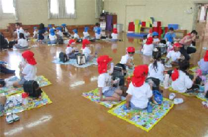 お昼ごはんの時間はシートを広げて、みんなでいただきます!たくさんのお友達や先生と食べるおにぎりは、とても美味しく感じました。