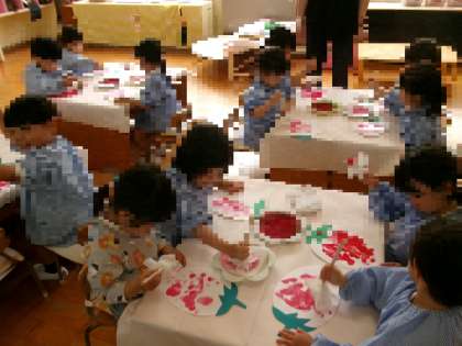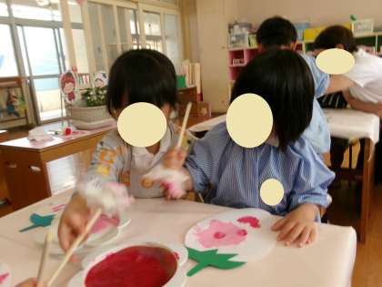 今日(5月22日)もも組は、絵具遊びをしました。もも組に赤いちごちゃんと白いちごちゃんが遊びにきました。でもなんだか白いちごちゃんの元気がないようです。「早く私も赤くなりたいな・・・」と寂しそうな白いちごちゃん。「白いちごちゃんを赤くするために、みんなでポンポンお化粧してあげてくれる?」「うん!」。白いちごちゃんにたくさんお化粧をしてどんどん赤くなってきました。「おいしくなあれ!」と子どもたち。最後は、赤くなった白いちごちゃんを大事にするために冷蔵庫に入れておきました。