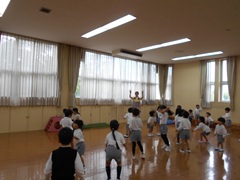 3歳児もも組と一緒に遊び、その後、5歳児も一緒になかよし遊びや体操をしました。